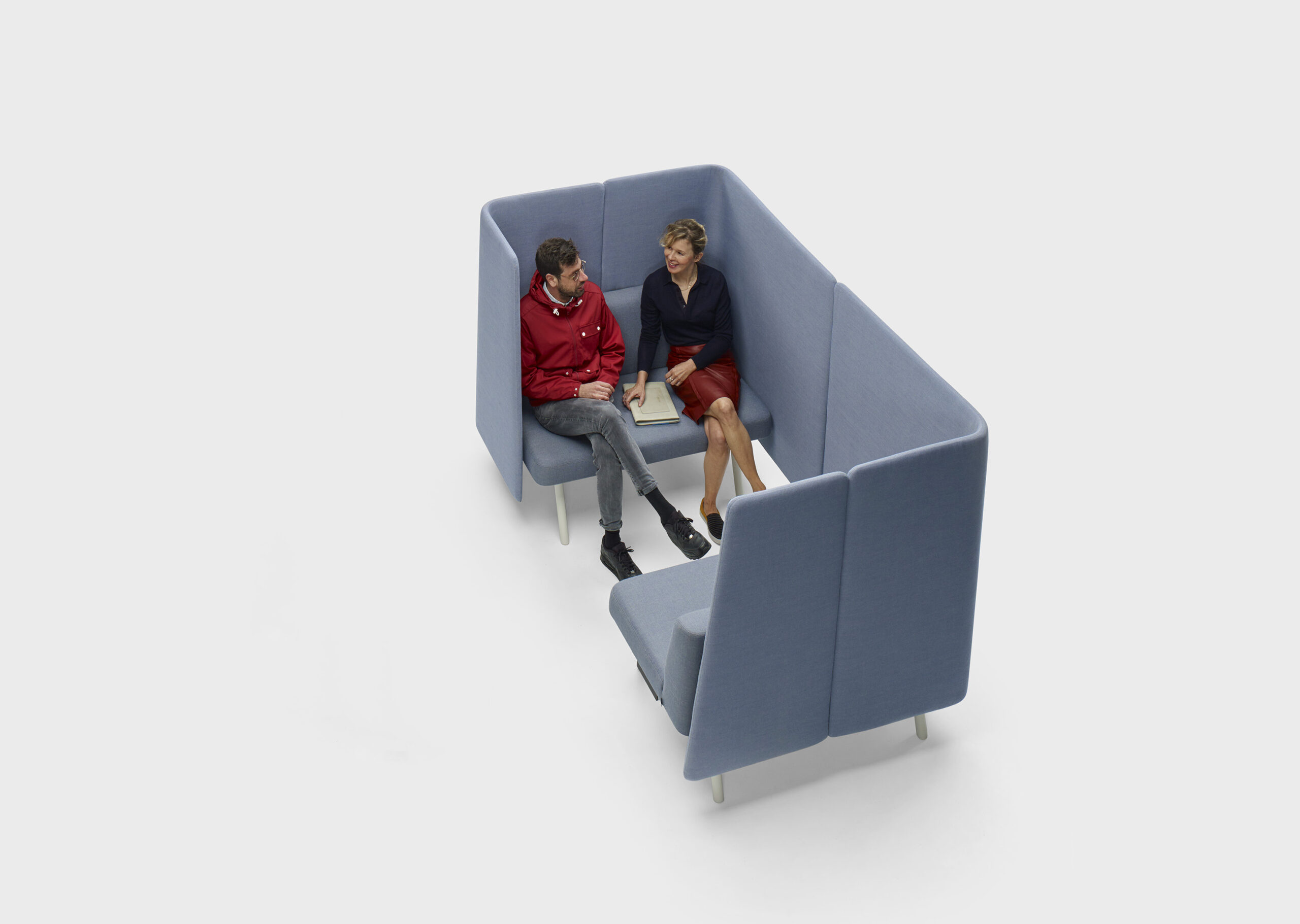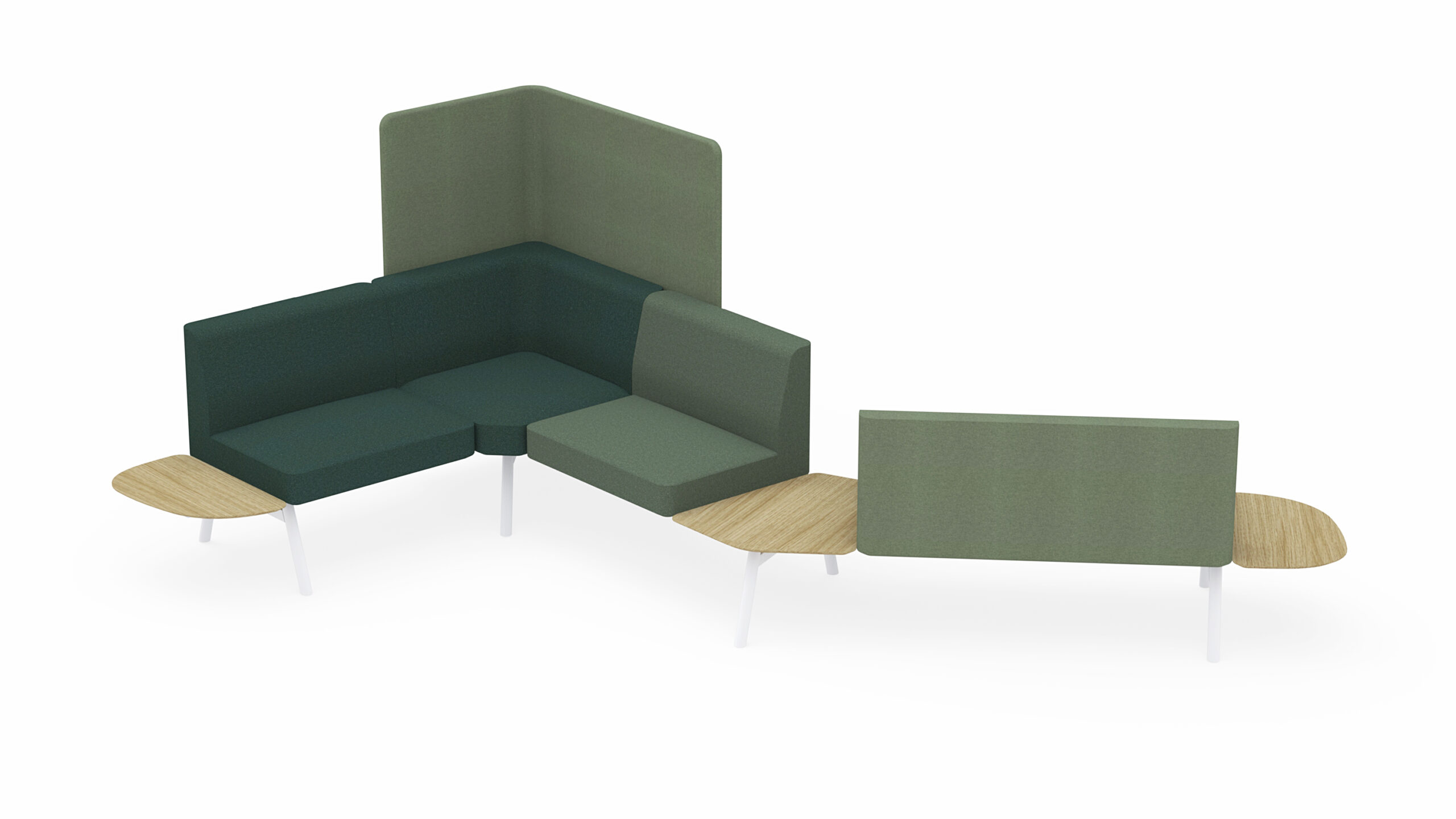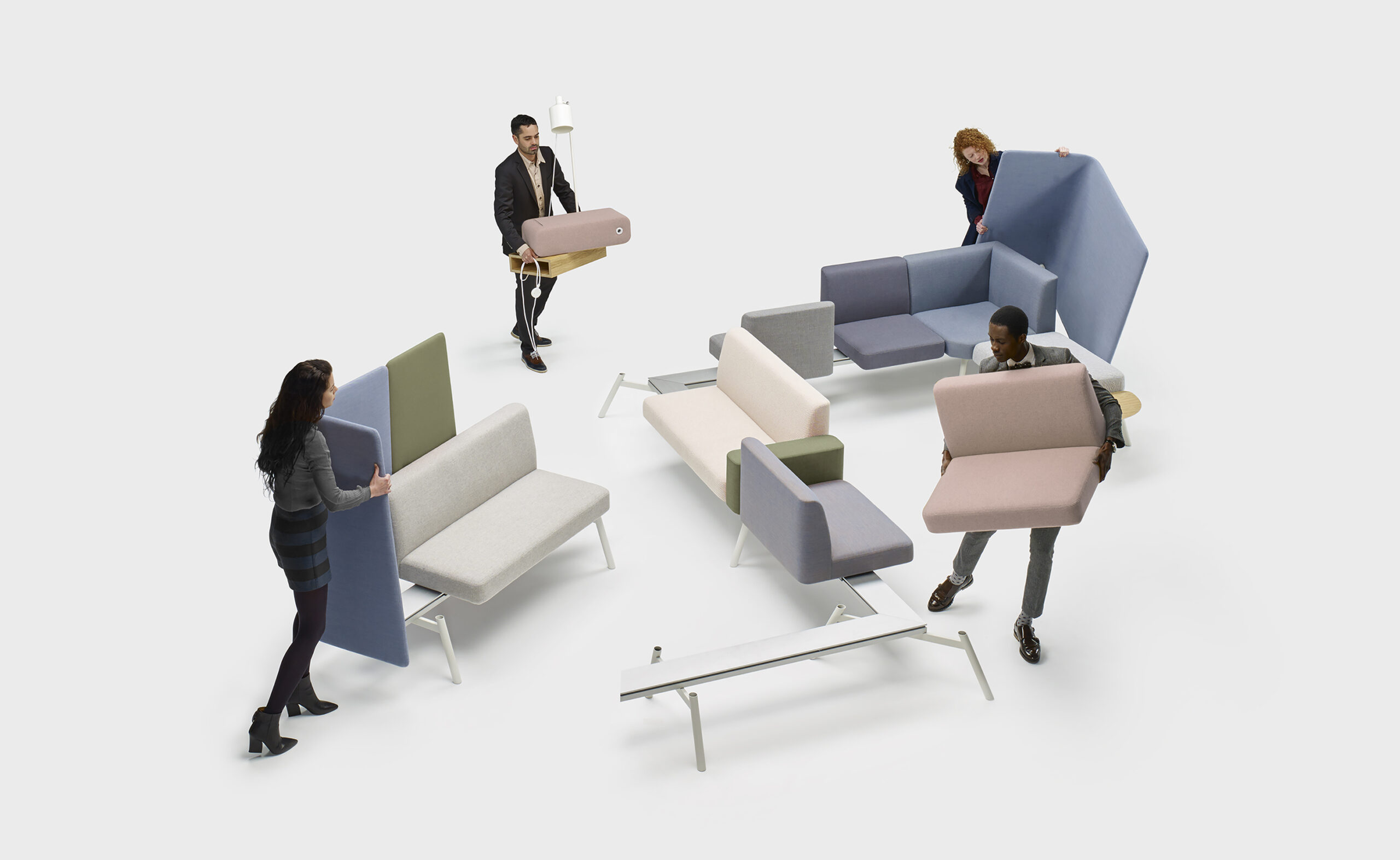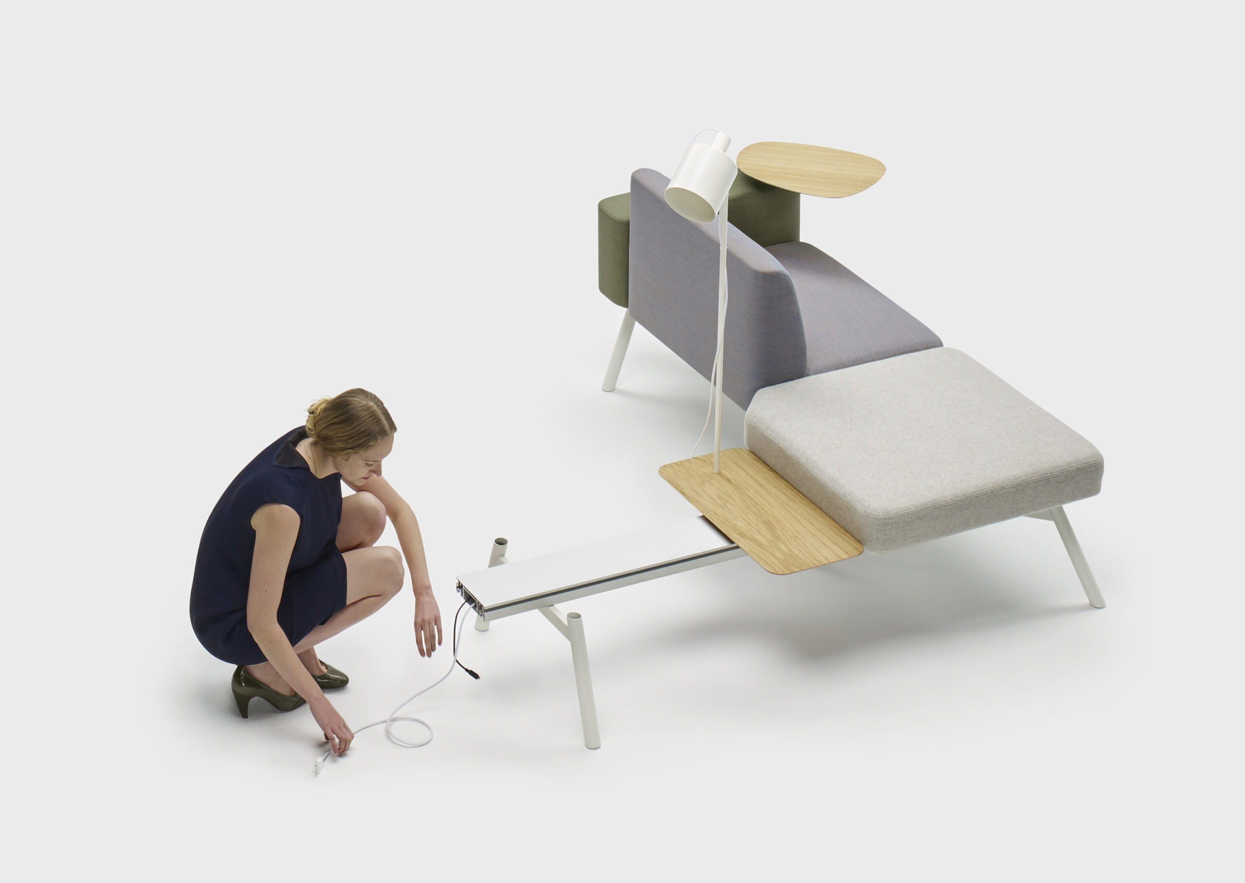 Montés sur un profilé en aluminium extrudé, les éléments d’assise, cloisons et tables s’assemblent et se démontent aisément. Ce profilé permet par ailleurs de modifier ou d’étendre la configuration à tout moment.