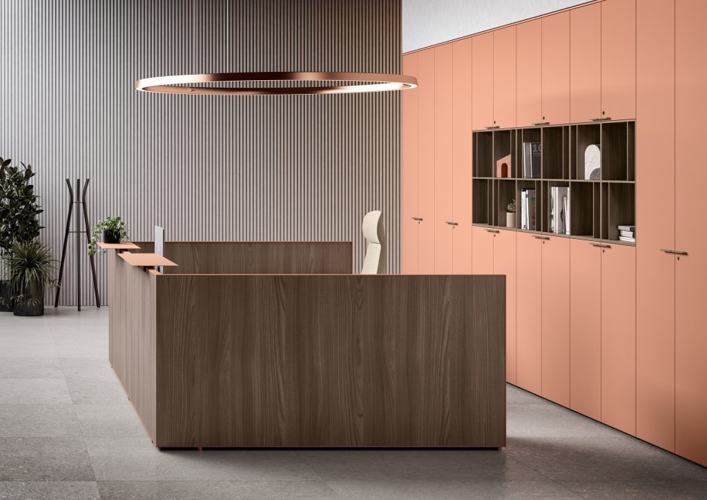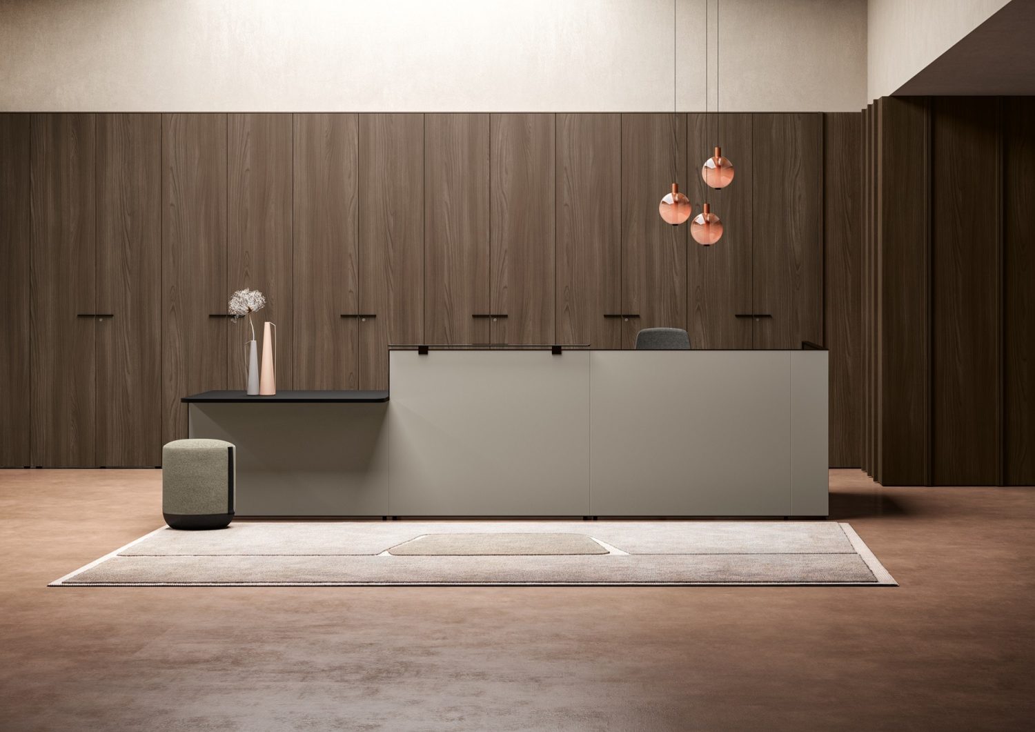 Cette collection de meubles de réception est conçue pour remplir diverses fonctions : signaler une présence, indiquer et suggérer une référence, communiquer et transmettre des informations, et travailler avec une ergonomie maximale.