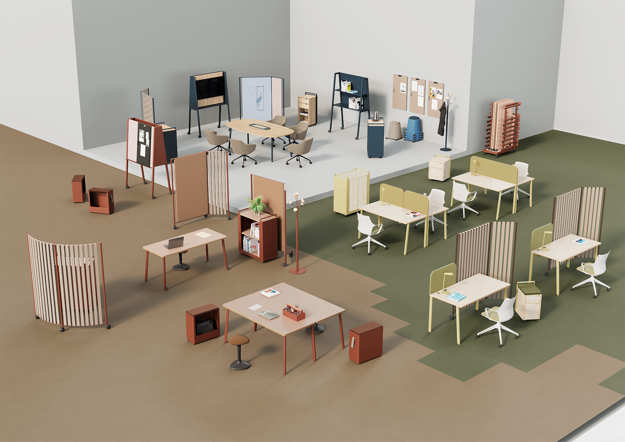 Grâce à des roulettes, un piètement nomade, des tableaux mobiles, des cloisons mobiles, des caissons mobiles le poste de travail évolue et dynamise vos espaces.