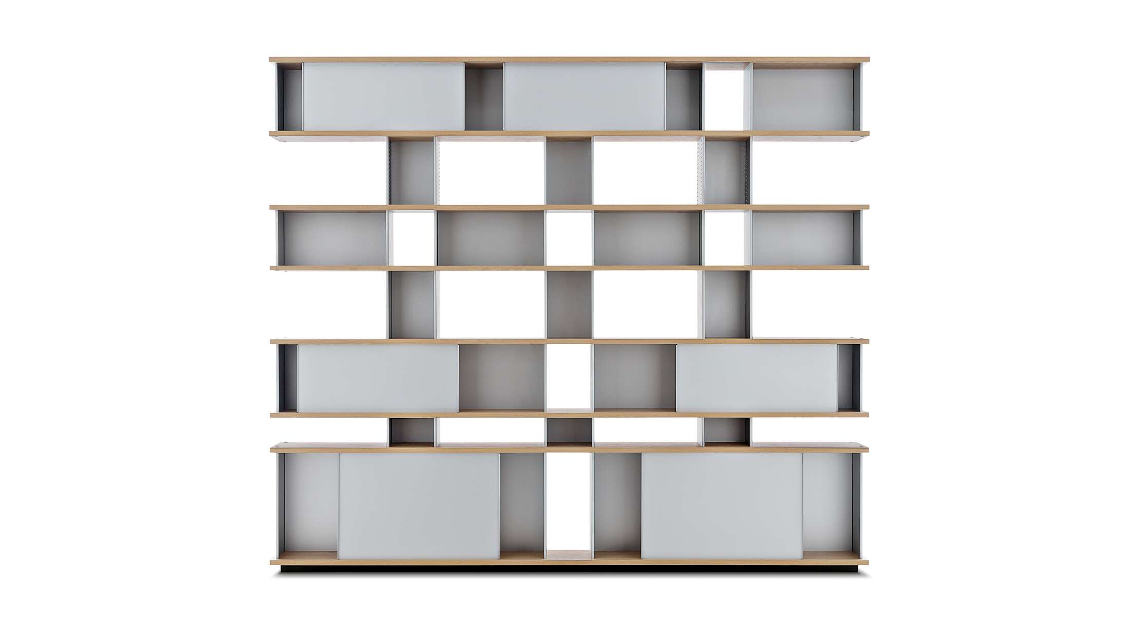 Le principe de la modularité permet des utilisations multiples dans différents environnements, en révélant différentes typologies allant du buffet aux meubles de rangement, de la bibliothèque murale aux compositions suspendues, en passant par les structures autoportantes à placer au centre de la pièce. Les modules qui peuvent être fermés par des portes, disponibles en aluminium anodisé ou dans un large choix de couleurs, libèrent l’imagination en suggérant un jeu d’alternances visuelles entre les pleins et les vides.