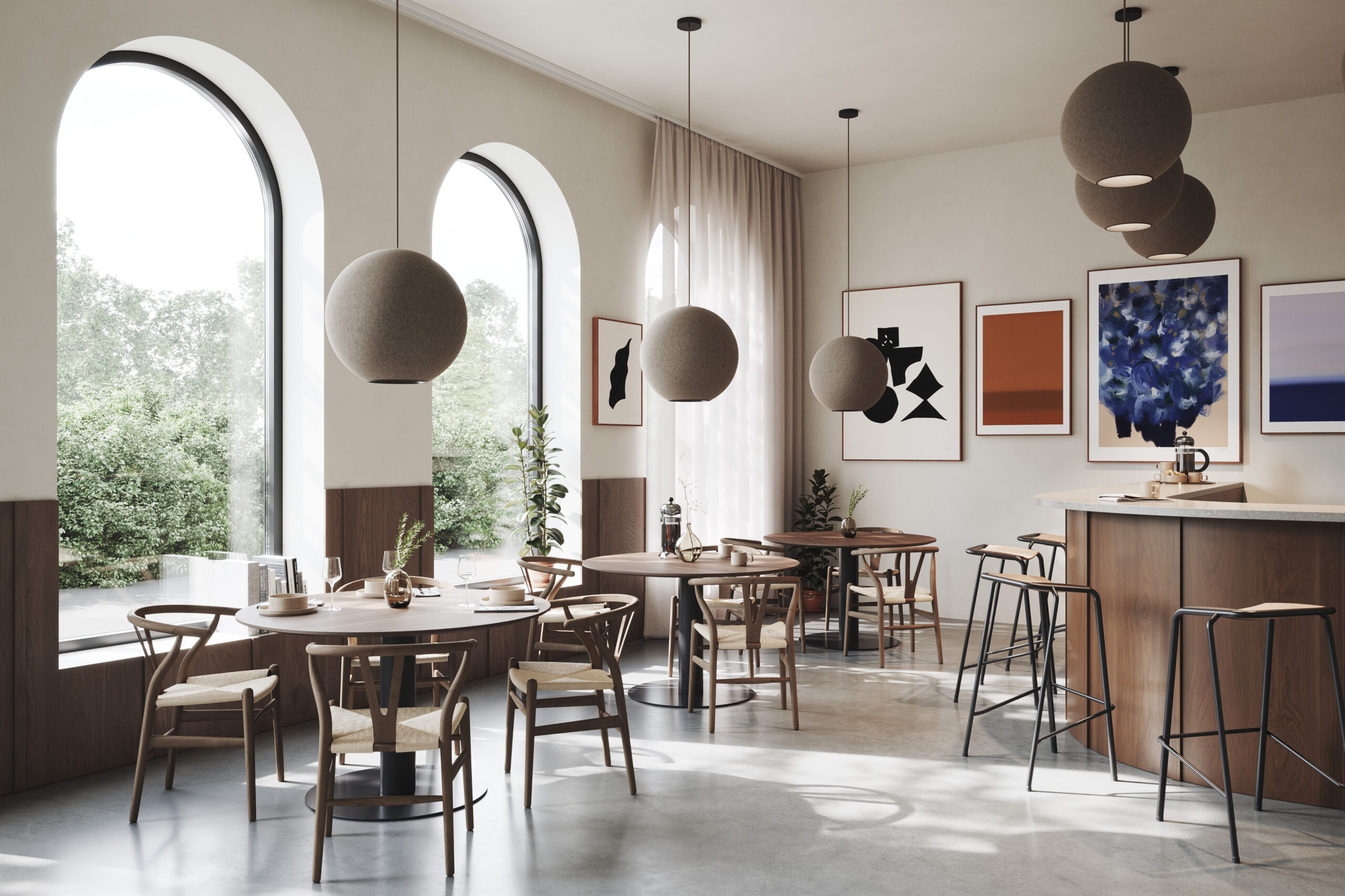 Un globe et un cône caché à l’intérieur du globe… Ces luminaires sont conçus pour réduire le niveau sonore dans un espace tout en offrant un éclairage de haute qualité classique, créant une lumière confortable, dirigée vers le bas et non éblouissante. Moon est disponible en de nombreuses couleurs.