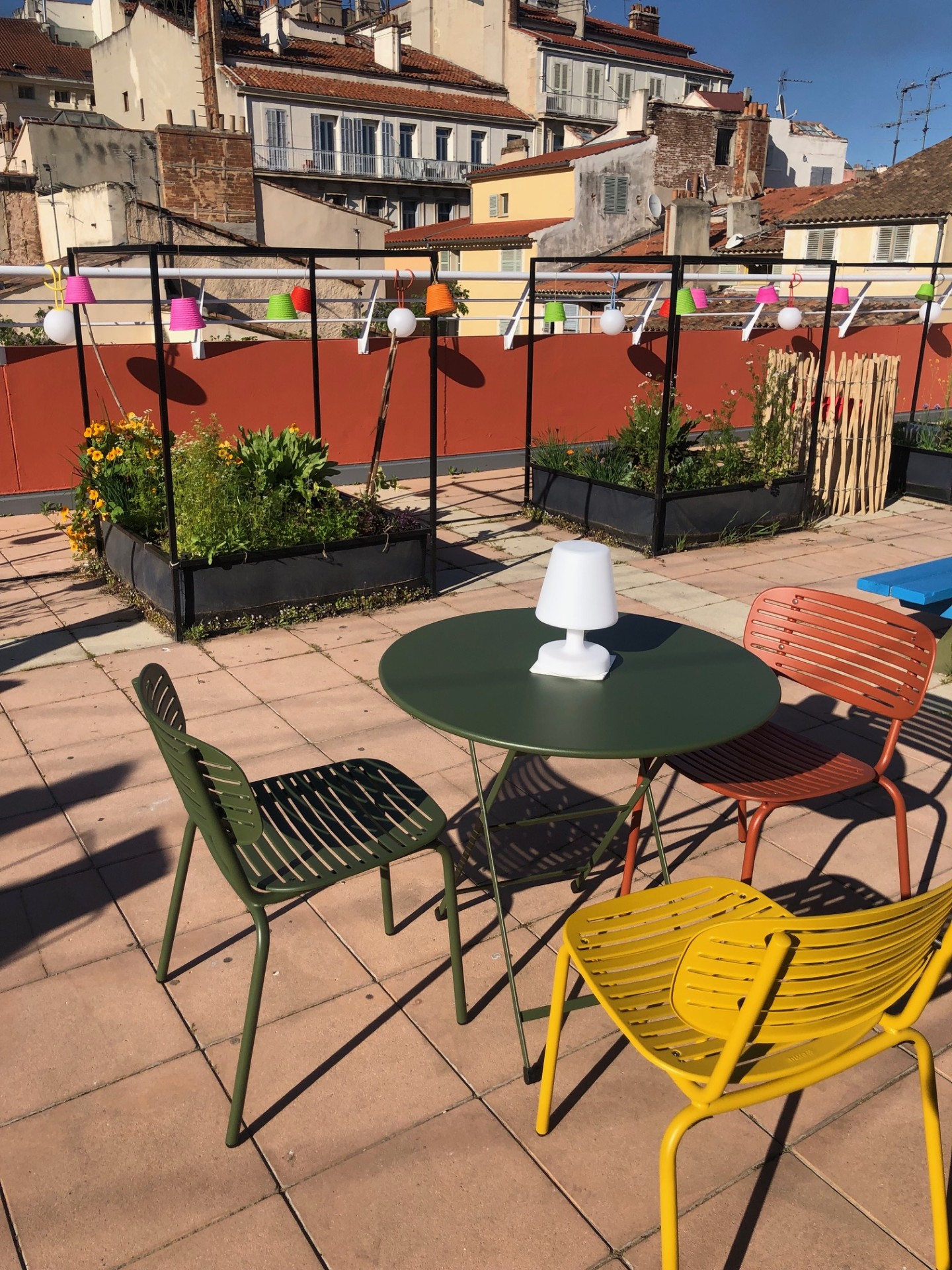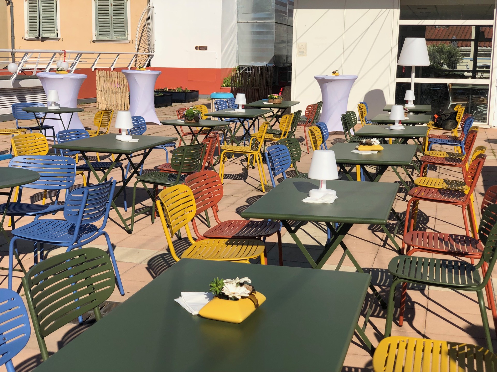Notre proposition : un mobilier adapté, chaleureux et résistant au climat et au soleil de Méditerranée. Pratique et facilement modulable avec les table pliantes « Arc en ciel ! » et les chaises chaises empilables « Mom » de Emu.