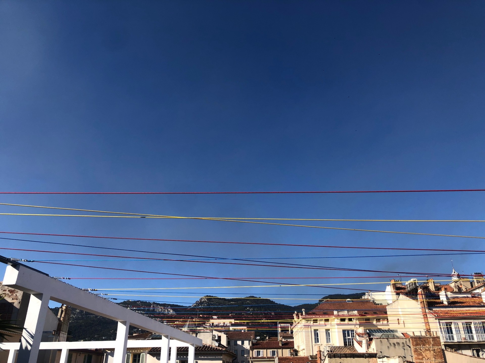 Il fallait donc trouver une astuce décorative pour redessiner l’espace et lui donner une structure : des cordages multicolores viennent habiller le ciel et délimiter l’espace en toute légèreté.